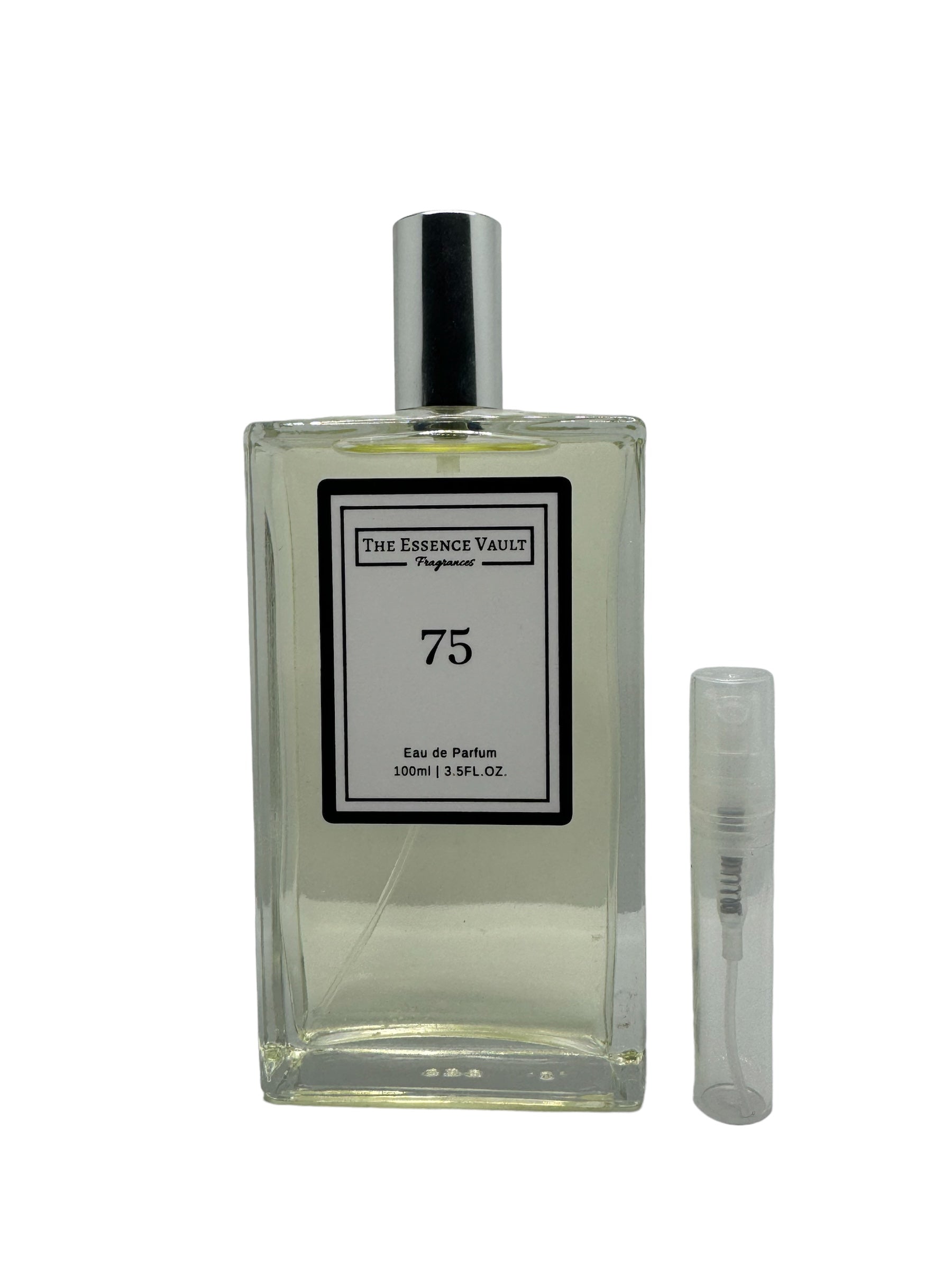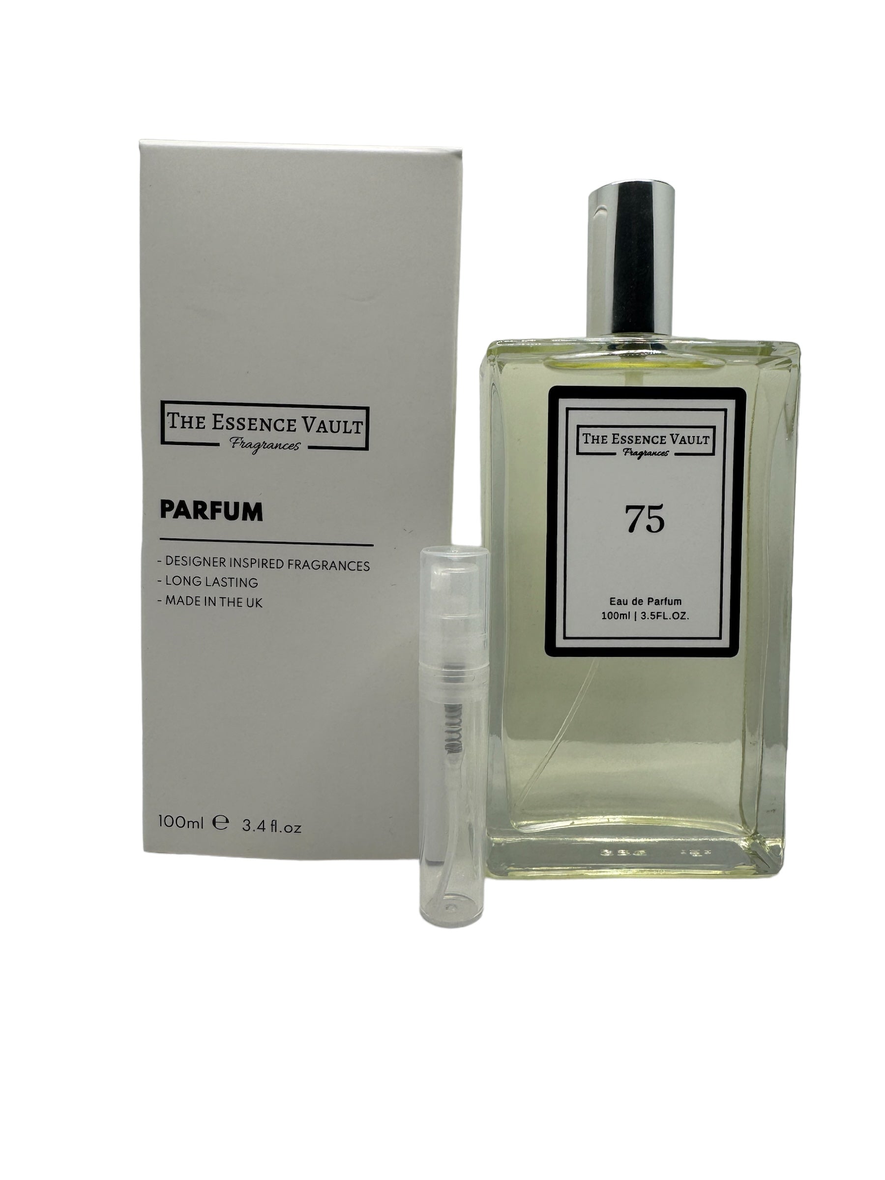 Parfymen The Essence Vault 75, inspirerad av Aventus for Her, är en elegant och feminin doft som kombinerar fruktiga och blommiga noter med en sofistikerad träig bas. Toppnoterna är uppfriskande och fruktiga, ofta med inslag av grönt äpple, bergamott och rosépeppar. Hjärtnoterna är blomstrande och rika, med noter av ros, ylang-ylang och sandelträ som ger doften en djupare karaktär. Basnoterna innehåller mjuka inslag av mysk, ambra och svartvinbär, vilket ger parfymen en långvarig och sensuell finish. Det är en parfym för kvinnor som vill utstråla styrka och elegans.